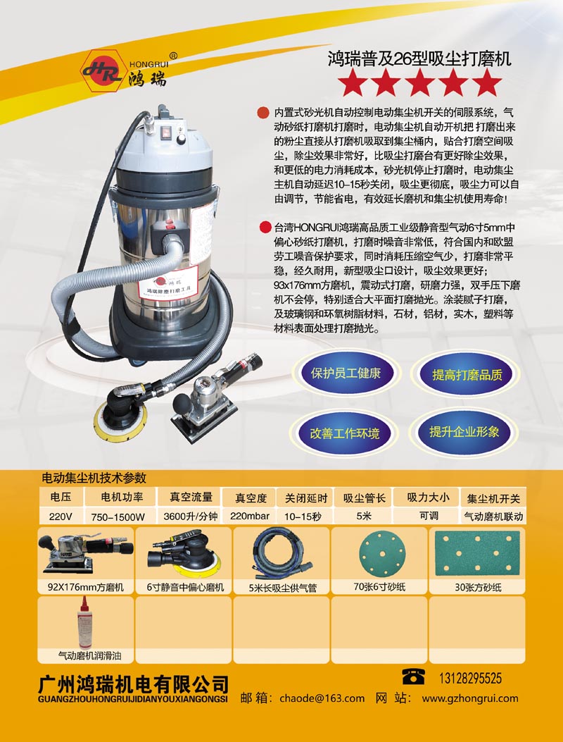 1、气动砂光机打磨时自动控制电动集尘主机开机吸尘,把打磨出来的粉尘吸取到集尘桶内,没有粉尘飞散,确保工作环境清洁和操作人员的身体健康