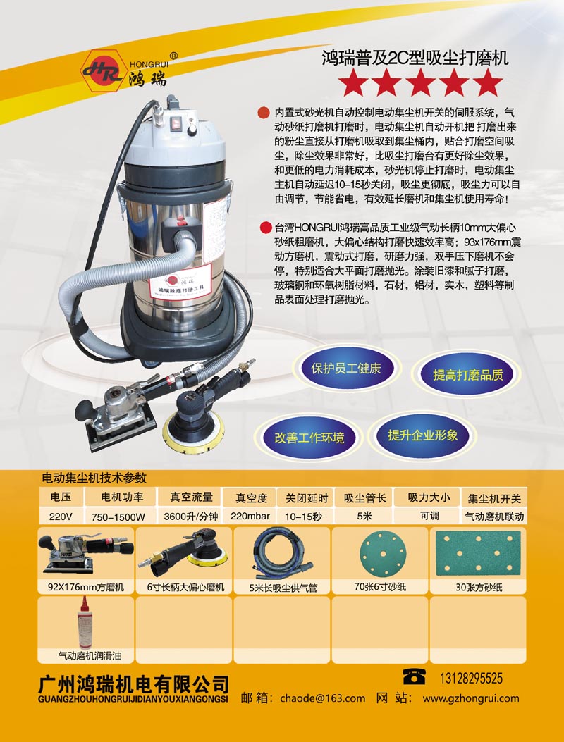 1、气动砂光机打磨时自动控制电动集尘主机开机吸尘,把打磨出来的粉尘吸取到集尘桶内,没有粉尘飞散,确保工作环境清洁和操作人员的身体健康