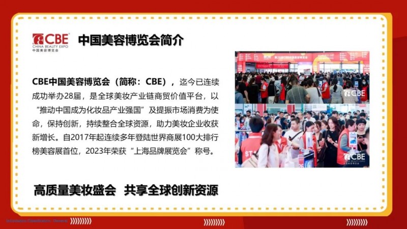 CBE上海美博会凭借其品质、专业和权威性的优势,已经成为中国乃至全球美容化妆品行业的重要盛会。而背后的主办方上海百文会展有限公司和英富曼集团更是为这一盛会的成功举办提供了坚实的保障和支持。