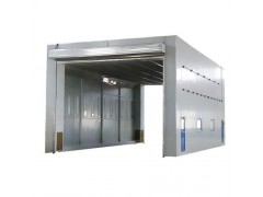 整体移动式喷漆间的设计目的,是为了满足较大型工件 打磨或喷漆的需要。一般情况下每套房体对应2~3个排风净化工位,哪个工位上的工件需要喷漆时,房体则行走移动到那个工位,其他工位可以继续打磨工作,待 房体内的工件喷漆完毕后,再控制移动房体行走到打磨完毕后的工件工位,如此设计可以实现大型工件的不间断连续喷漆工作。房体为钢结构构造,房体立柱下面设置有两台电动驱动行走机构,行走机构沿地面轨道行走。移动房体两端设置有电动卷帘大门,房体行走时,大门升起,待到达位置时,大门降落关闭。大门yu行走机构由电气控制部分连锁控制,大门完全升起后,房体才可移动行走。
