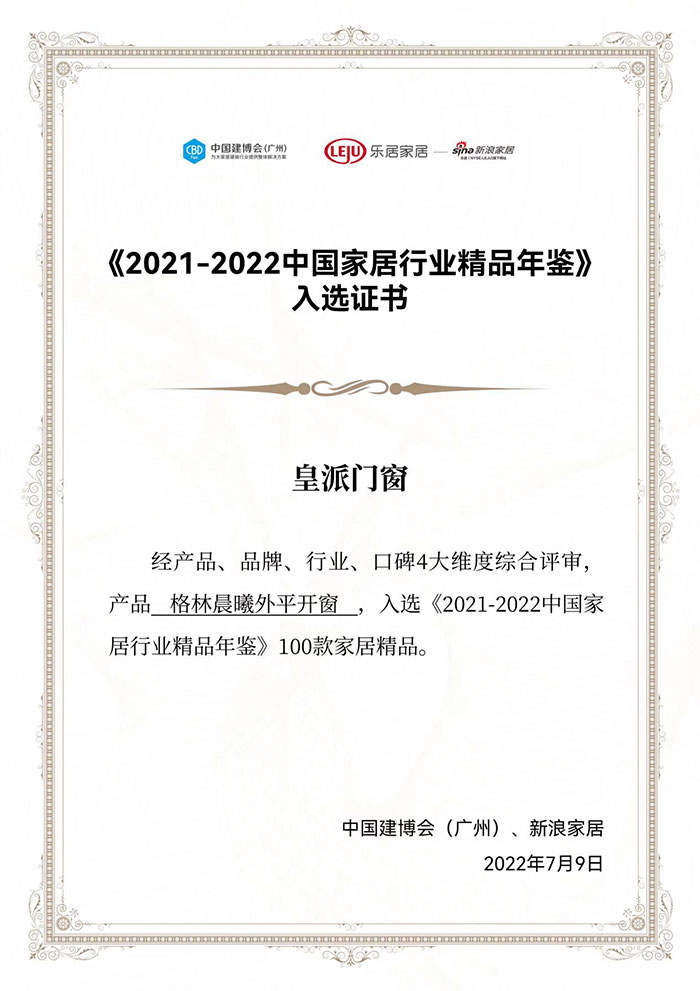 实力见证,荣耀加冕,皇派门窗持续用开云球赛实力见证品牌力量。凭借时尚的审美、卓越的品质和良好的口碑,皇派门窗格林晨曦系列荣誉入选《2021-2022中国家居行业精品年鉴》。朱梦思在中国家居生态大会暨《2021-2022中国家居行业精品年鉴》发布会上表示,信息的能量非常大,我们应积极拥抱这个万物互联的时代,一方面要爱惜自己的羽毛,踏实做好开云球赛,积累客户信任。另一方面,企业要有自己鲜明的价值主张,与消费者达成价值的同频共振,就可能创造无限的品牌奇迹。