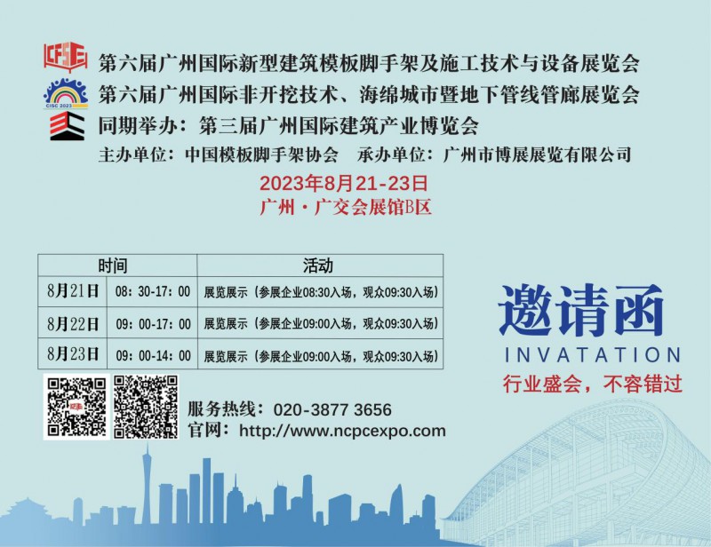 由中国模板脚手架协会主办,广州市博展展览有限公司承办的“第六届广州国际新型建筑模板脚手架及施工技术与设备展览会”、“第六届广州国际非开挖技术、海绵城市暨地下管线管廊展览会”(以下简称“本届展会”),将于2023年8月21-23日在广州广交会展馆B区9.1-11.1馆隆重举行。同期举办“第三届广州国际建筑产业博览会”(由广州市住房和城乡建设局作为指导单位,广州市建筑业联合会主办)。