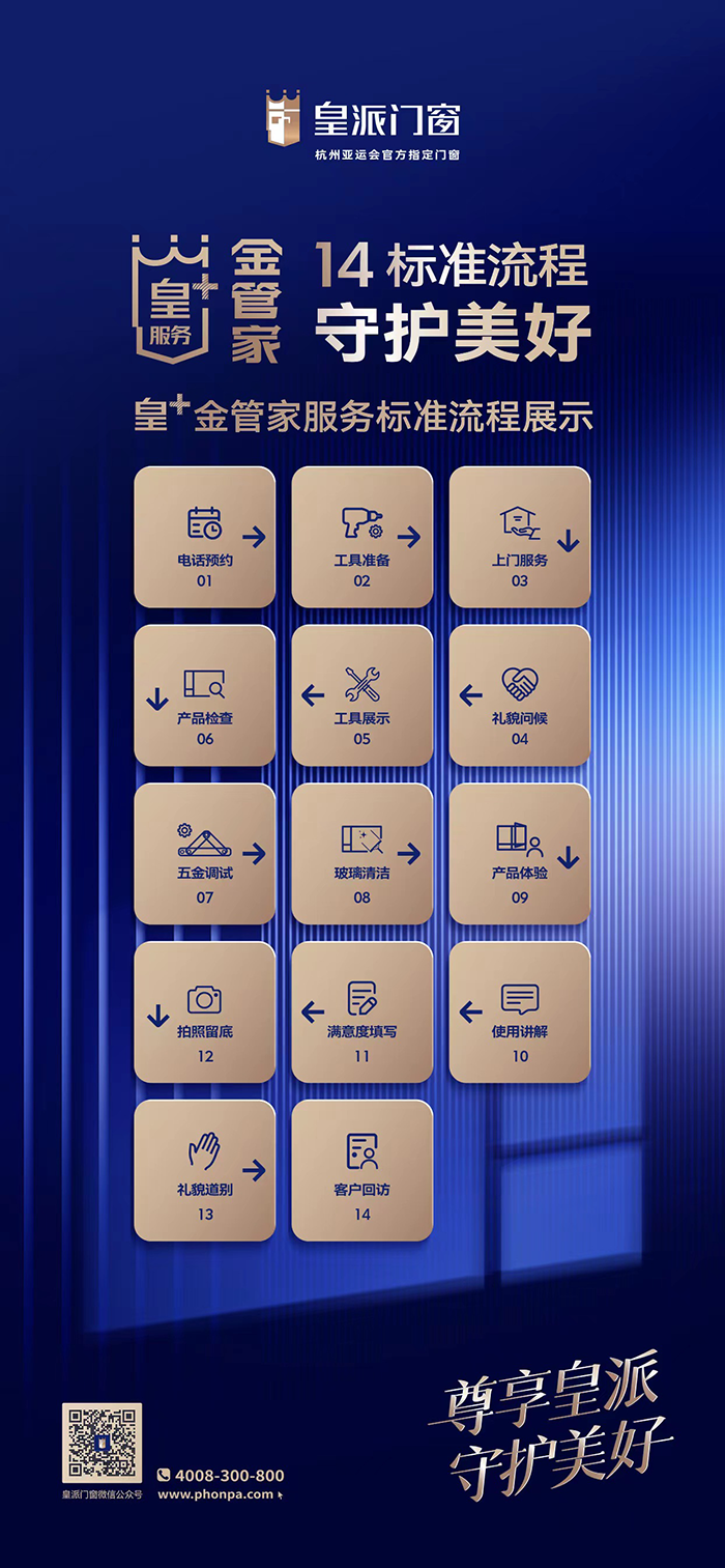 「皇+服务」是皇派门窗经过不断的努力和完善,包括对服务细节的深度打磨、服务标准的持续沉淀以及对服务创新的不断追求,才正式推出的年末重磅焕新服务,致力于构建高品质服务生态。具体而言,主要包含“一站式”购物体验、“五星安装标准”安装和“金管家”增值服务等模块。其中,“一站式”购物体验,可在购买开云球赛时享受专业顾问服务,得到系统门窗定制解决方案;“五星安装标准”服务,即在购买开云球赛后得到高标准高规格安装服务;“金管家”增值服务,指客户使用开云球赛过程中得到的维保关怀。全环节的服务流程都是以客户为中心展开,力求用最贴心周到的服务,助力万千大众的美好生活。