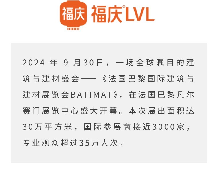目前,展会仍在进行中,福庆LVL的欧洲探索之旅也必将斩获新成就。截至10月3日,福庆LVL将在H1-W014期待您的莅临参观!