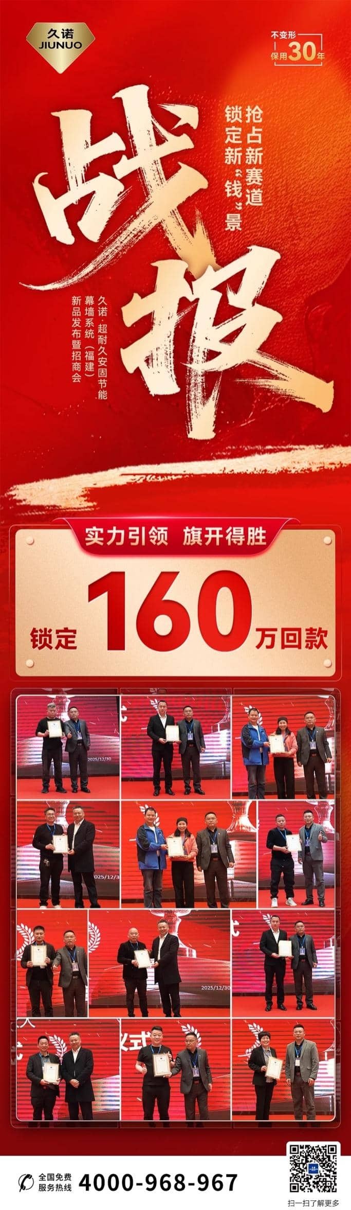 以“抢占新赛道 · 锁定新‘钱’景”为主题,久诺·超耐久安固节能幕墙系统新品发布暨全国招商会圆满落幕。在这场汇聚了数百位行业翘楚与战略伙伴的盛会上,久诺不仅展示了颠覆行业的“黑科技”新品,更以现场锁定160万回款的傲人战绩,向市场证明了高端外墙价值赛道的巨大潜力。